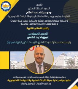 اصدر الدكتور مصطفى مدبولي رئيس مجلس الوزراء قرارا بتعيين المهندس عمرو احمد لطفي رئيس مجلس ادارة شركه ميدور عضوا بمجلس ادارة مدينة الابحاث العلمية والتطبيقات التكنولوجية.