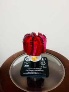 وفي نهاية اللقاء قام المهندس شادي عزيز بتسليم المهندس صلاح عبد الكريم درع على شكل نموذج محاكي ثلاثي الأبعاد GEB-003 لأول رأس حفر مصرية حجم 25ر12 بوصة مزين بألوان العلم المصري تقديراً لدور الهيئة في دعم الصناعة المحلية وذلك احتفاءً بنجاح استخدامها المنتج في حفر بئر WD09-B2 بحقول شركة خالدة للبترول بالصحراء الغربية بنجاح.