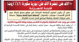 اعلنت شركه موبكو للاسمدة عن مزايدة عامة بالاظرف المغلقة لاستغلال وبيع كميات كبيرة من اليوريا في السوق المحلي . وتصل الكميات الي نحو 10 الاف طن كورات يوريا حيث حددت الشركة آليات المزايدة كالتالي :